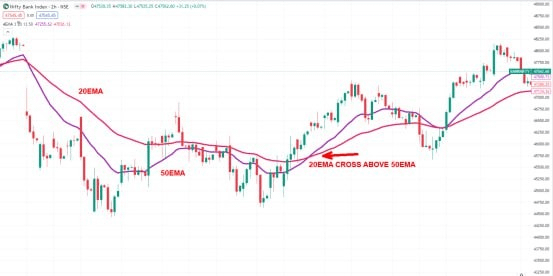 The second rule of this moving average strategy is the need for the price to trade above both 20 and 50 EMA. Also, we need to wait for the EMA crossover, which will add weight to the bullish case. We refer to the EMA crossover for a buy trade when the 50-EMA crosses above the 50-EMA.
