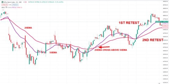 The conviction behind this moving average strategy relies on multiple factors. After the EMA crossover happened, we need to exercise more patience. We will wait for two successive and successful retests of the zone between the 20 and 50 EMA.