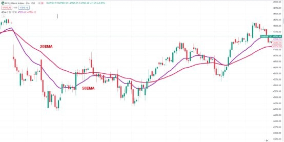 The first step is to set up our charts properly with the right moving averages. We can identify the EMA crossover at a later stage. This strategy uses the 20 and 50-period EMA.
